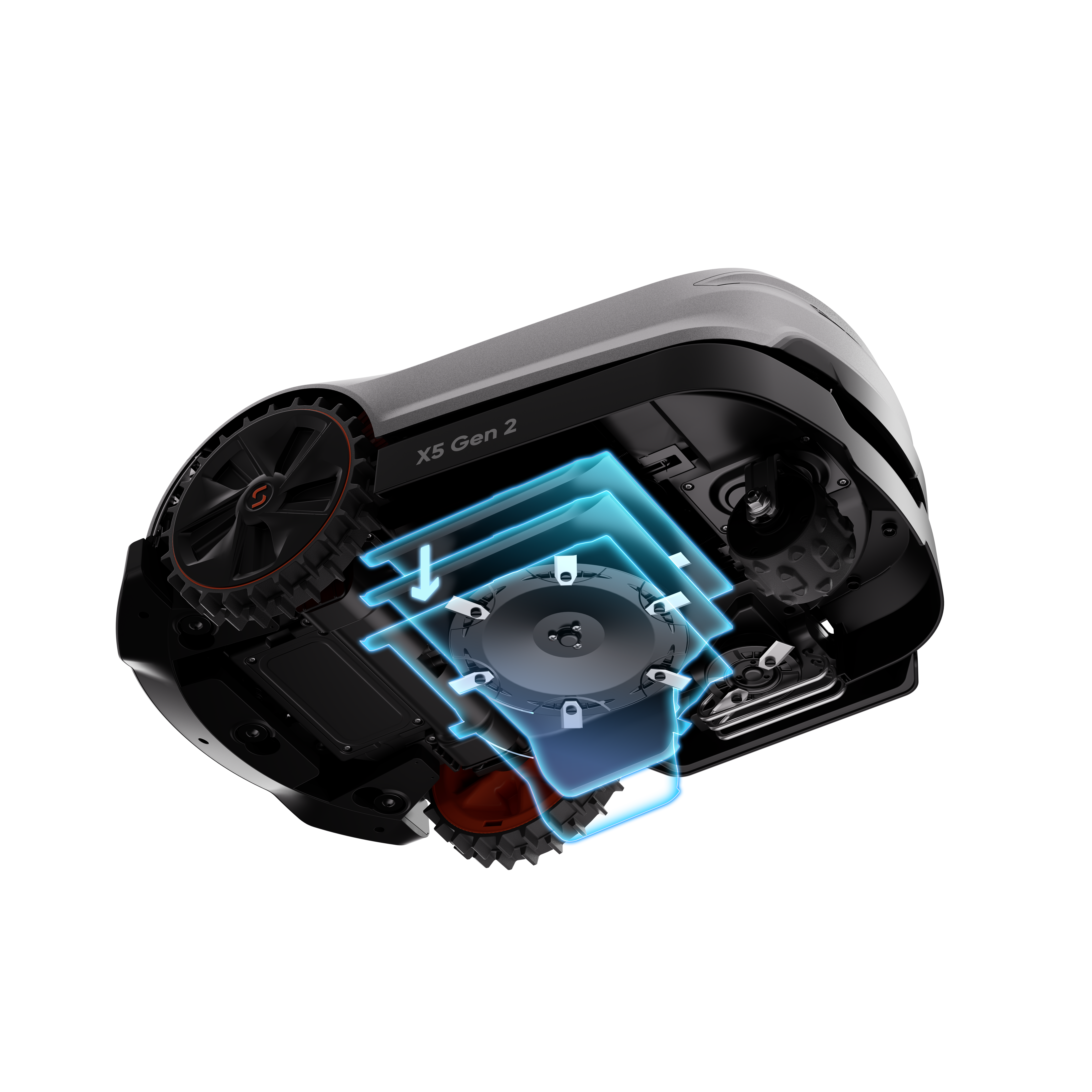 Der X5 GEN 2 verfügt über ein leistungsfähiges Mähwerk mit 22 cm Schnittbreite und einer einstellbaren Schnitthöhe von 20–60 mm. Sechs rotierende Messer sorgen für ein gleichmäßiges und sauberes Schnittbild.